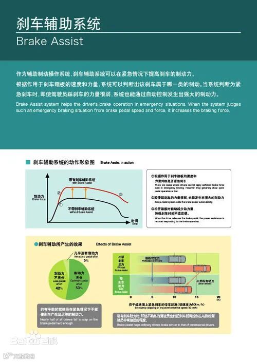 据统计,90%的驾驶者遇到在紧急情况时,均不能采取快速、及时的制动措施,而制动辅助系统则可借助油门和制动系统上的感应器,来判断驾驶者对油门踏板刹车踏板的操作过程,比如踩踏时间或力度来判断是否遇到紧急情况而需要采取紧急制动。如果系统判断当前力度并不能达到安全制动效果,此时该系统便会在不到1秒的时间内把制动力增至最大,使车辆及时、有效的完成制动。