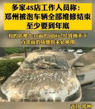 另外,有媒体采访郑州4S店后发现,多家4S店工作人员称:郑州被泡车辆全部维修结束,至少要到年底才能结束。有的4S店,整个30亩园区已经容纳不下,百余亩的场地也未必够用。
