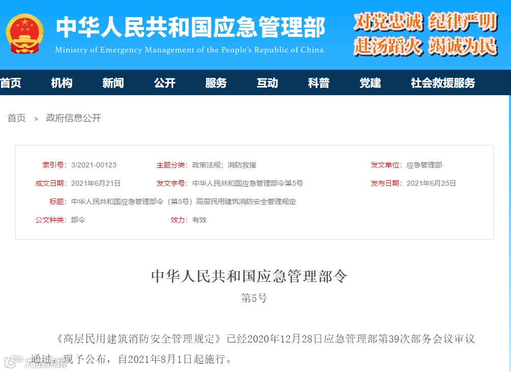近日,中华人民共和国应急管理部公布了《高层民用建筑消防安全管理规定》自2021年8月1日起施行,即应急管理部令第5号。