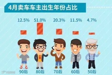 大数据报告显示,4月卖车车主中,“80后”占比约为51.0%。据分析,“80后”稳居二手车市场的主力群体,并且占比过半,这说明,已成为职场、家庭、社会中流砥柱的“80后”,有更强的置换需求。“70后”紧追其后,占比20.3%;“90后”占比为12.5%。