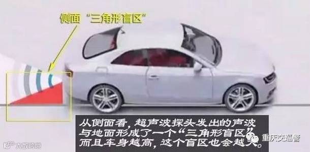 倒车雷达之类的电子辅助设备,由于雷达的发射范围是呈圆锥状的,因此倒车雷达主要的盲区范围就是雷达超声波探头发出的声波与声波之间没被“照射”到的范围。