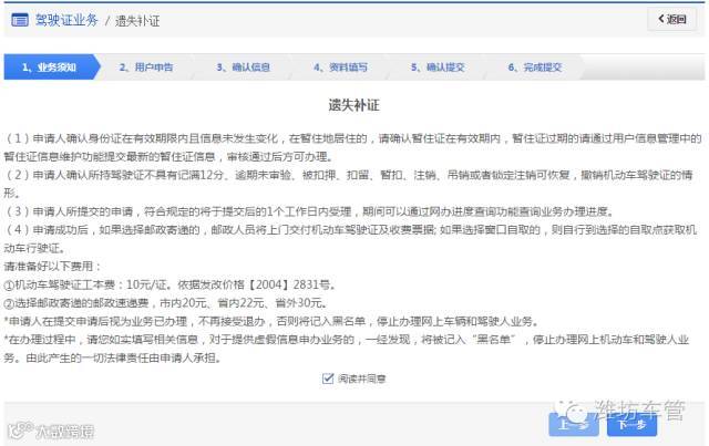 在该步骤,用户需认真阅读其内容,包括:办理遗失补证需要注意的各项内容和相关责任,如下图所示。同意的,勾选“阅读并同意”,点击 [下一步] 进入步骤2 [用户申告]: