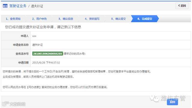 该步骤提交成功后,系统生成业务流水号。该步骤提交成功后,系统将于提交后的一个工作日(不含当天)受理,届时会发送短信告知受理结果。用户可以根据该业务流水号在网办进度中查询业务办理进度。