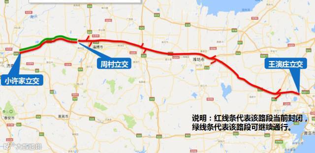 (二)小许家枢纽互通立交(G35 K7+093)至周村互通立交(G20 K266+677)段青岛方向封闭。