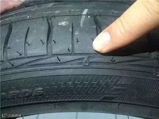 位于轮胎侧面,是一个小小的▲形状。一旦轮胎磨损到了与▲的尖角平齐的程度,那么这条轮胎就必须要更换了。