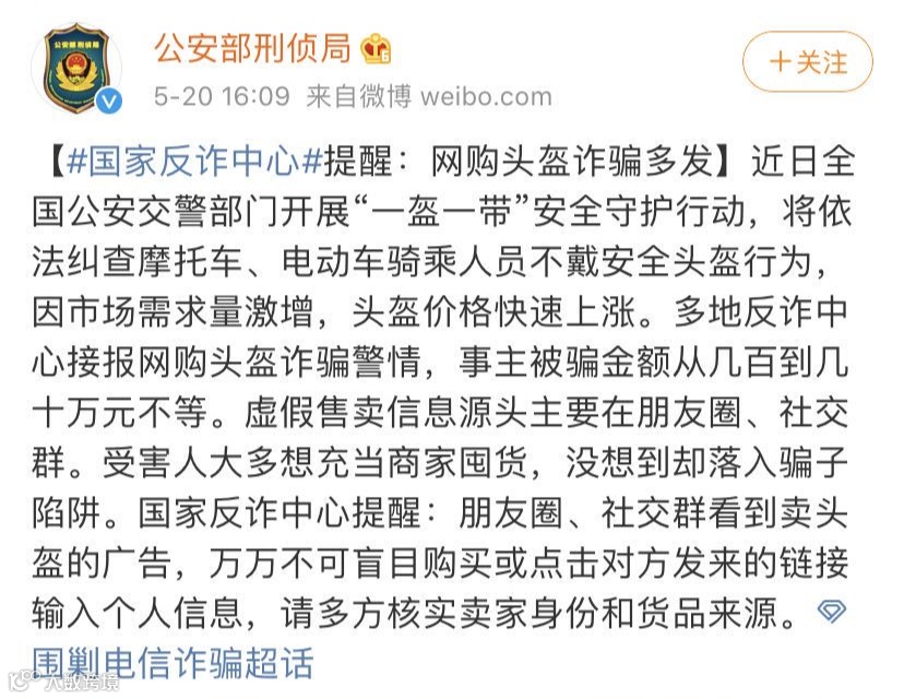 头盔诈骗多发,国家反诈中心紧急提醒