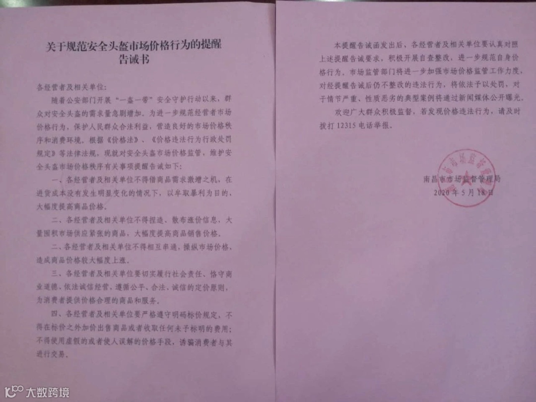 5月18日,江西省南昌市市场监管局发布提醒告诫书。其中指出:经营者及相关单位不得借商品需求激增之机,在进货成本没有发生明显变化的情况下,以牟取暴利为目的,大幅度提高商品价格;