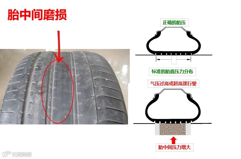 高胎压:如果轮胎气压过高,轮胎的刚性增大,变形和接地面积减小,首先会导致使胎面中部的单位压力增大,磨损加剧,产生胎冠中央磨损现象,影响到舒适性并将降低轮胎寿;同时,还会使轮胎抓地力减少(尤其在湿滑路面,会影响制动距离),也会造成轮胎的磨损速加快,导致轮胎磨损不均匀。