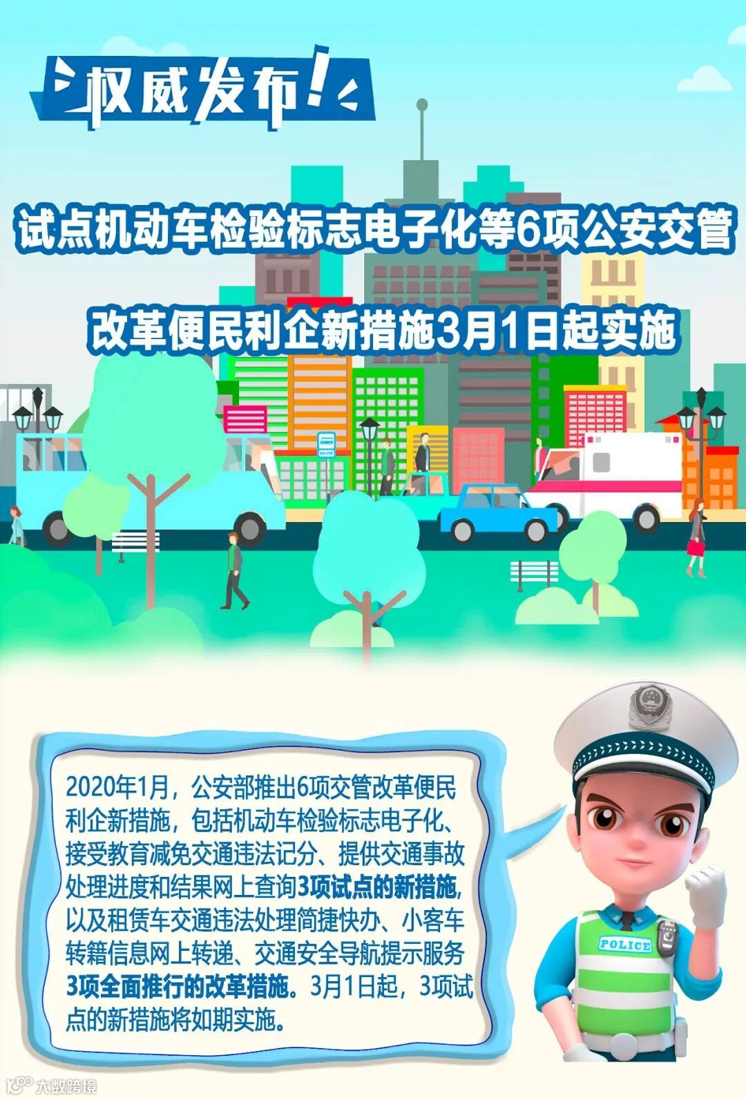 2020年1月,公安部推出6项交管改革便民利企新措施,包括机动车检验标志电子化、接受教育减免交通违法记分、提供交通事故处理进度和结果网上查询3项试点的新措施,以及租赁车交通违法处理简捷快办、小客车转籍信息网上转递、交通安全导航提示服务3项全面推行的改革措施。3月1日起,3项试点的新措施将如期实施。