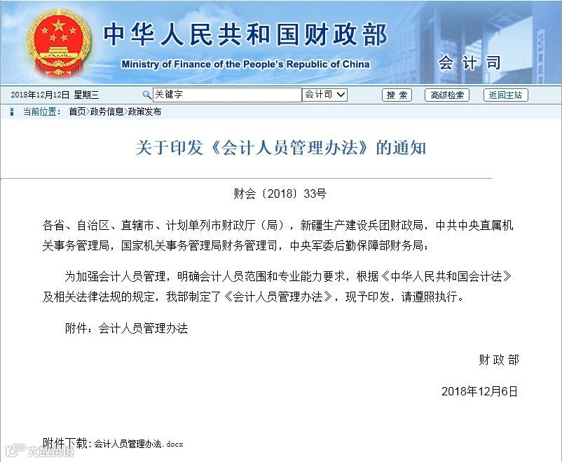 继8月份发布征求意见稿之后,财政部于12月正式出台关于印发《会计人员管理办法》的通知,重点变革事项如下: