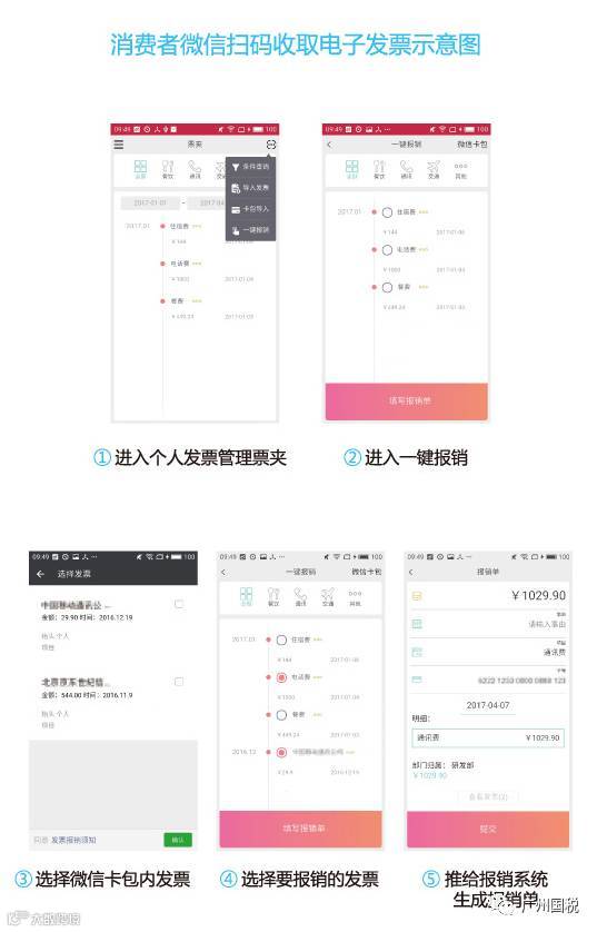 第六步:发票报销。电子发票可通过电子形式报销,也可自行打印版式文件进行报销。