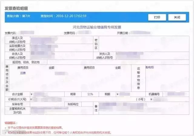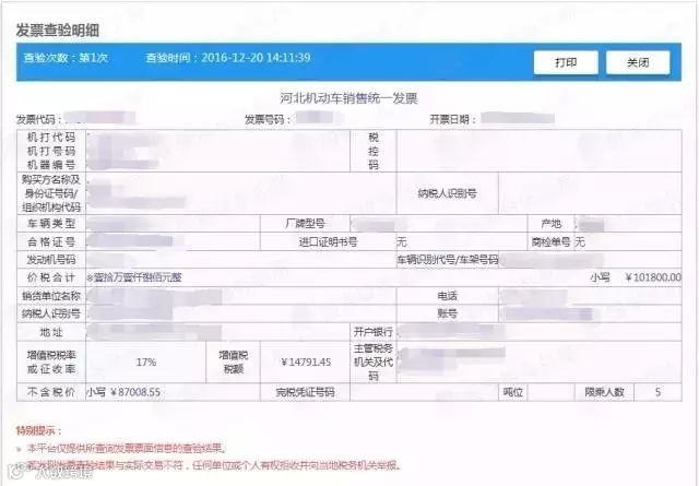 1、纳税人输入的发票校验信息与税务机关电子信息一致,则显示相关的发票详细信息(如发票已被开具方作废,则在查验结果中显示“作废”标识)。
