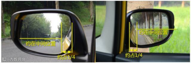 绝大多数人都是按照这个方法调节后视镜的:左右后视镜留1/4看到车身,天地各一半。
