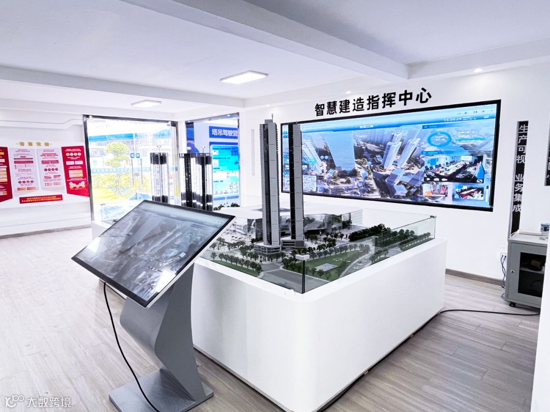 白鹅潭智慧展厅总面积90㎡。展厅构造由企业发展历程、智慧建造配套及企业简介、智慧建造指挥中心、党政宣传中心、CIM智慧工地管控平台、塔机安全监控系统介绍六大板块构成。