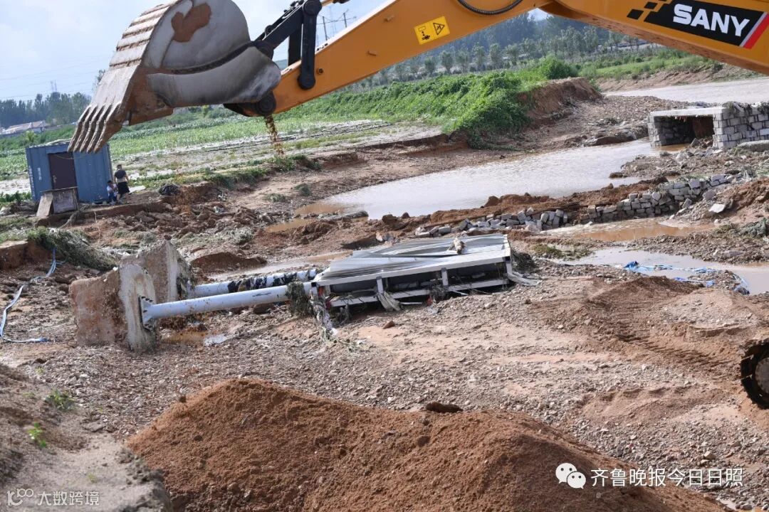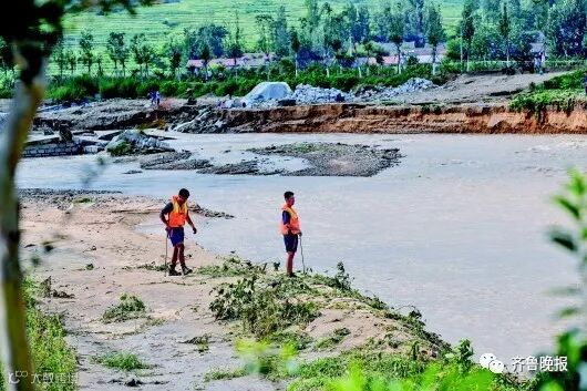 5日下午,齐鲁晚报·齐鲁壹点记者赶到日照西湖镇大花崖村,在一处失踪人员落水处,这里竖着一块警示牌,写着“水深危险,严禁游泳”等字样,此时河流仍然很湍急。河岸边上,一高炮广告牌被大水冲倒,两侧的玉米也全被水冲倒在地。几台挖掘机正在受淹的低洼区域填充土壤。