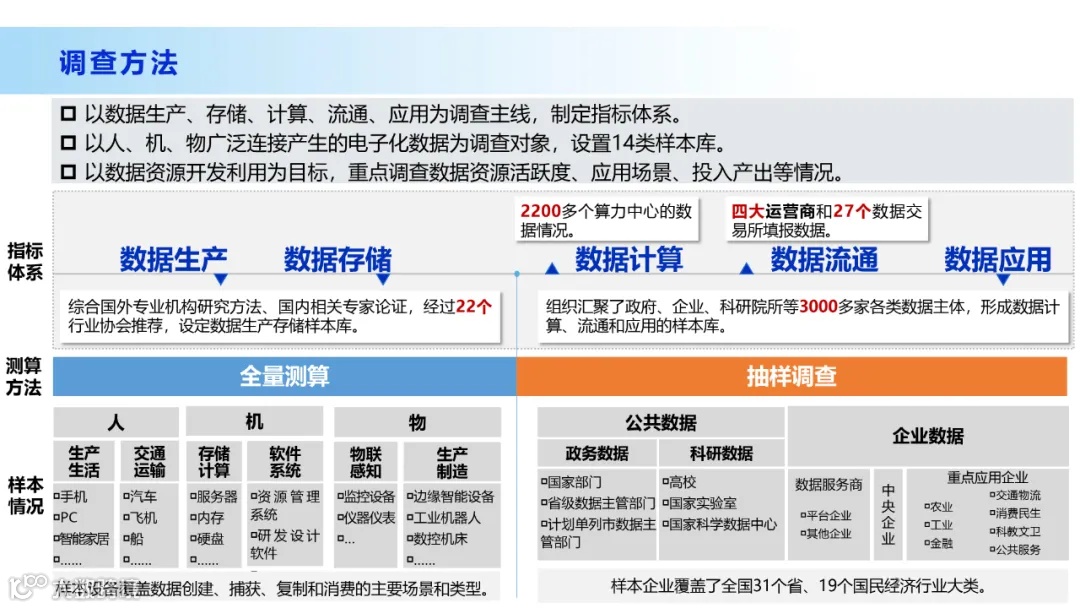 报告以3000多家调查样本为基础,以人、机、物广泛连接产生的电子化数据为调查对象,采用全量测算和抽样调查方法,通过数据分析、建模测算、结果校验,较为全面地呈现了我国数据资源发展现状。