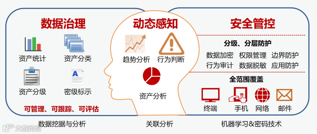 区别于传统数据泄露保护系统只是关注在加密防护技术手段上面,该平台更加注重数据治理,帮助企业从传统终端数据防护层面向企业数据治理层面延伸拓展。使企业能准确摸清企业内部敏感数据分布与流动态势,并以此为基础,基于数据价值进行精细分类分级管控,将有限资源准备集中到重点敏感数据的使用和保护中。