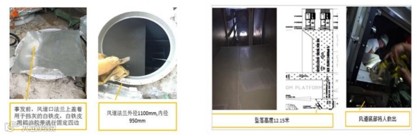 后经调查组试验,试验人员站在白铁皮边缘,白铁皮局部出现变形下坠现象,试验证明白铁皮铺设在风道口上,存在人员坠落的风险。