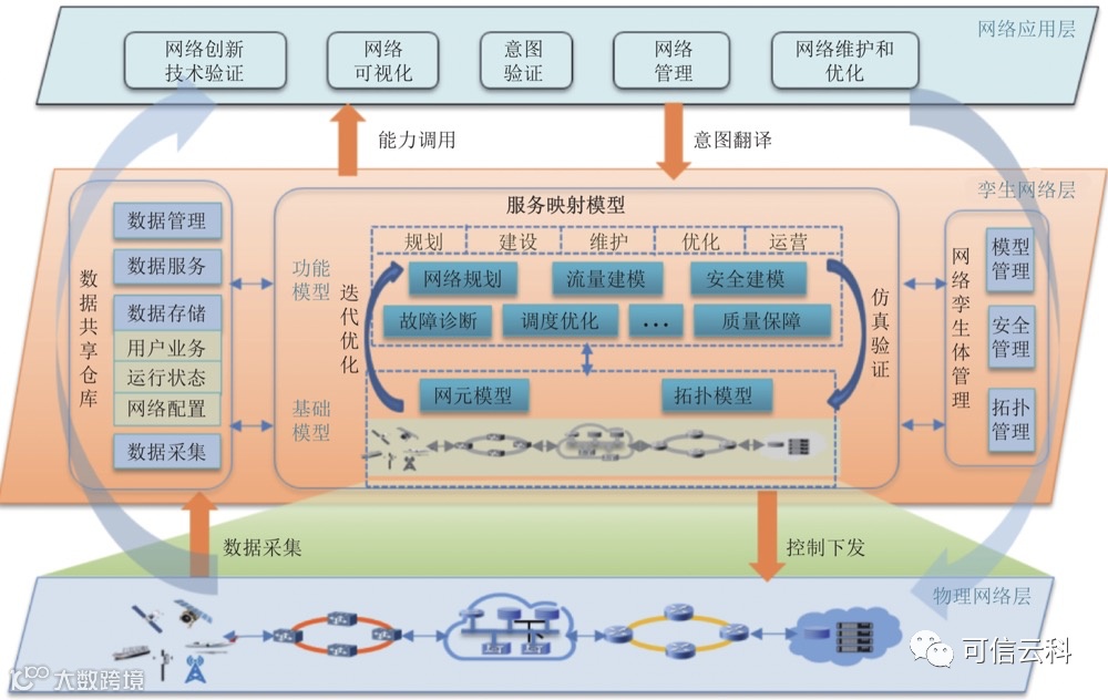 1) 数据是构建数字孪生网络的基石, 通过构建统一的数据共享仓库作为数字孪生网络的单一事实源, 高效存储物理网络的配置、拓扑、状态、日志、用户业务等历史和实时数据, 为网络孪生体提供数据支撑.