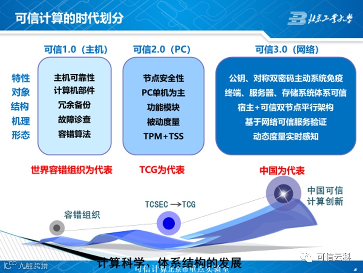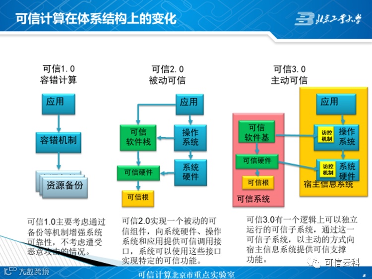 可信3.0是基于我国网络安全实际情况,由我国相关科研人员自行研发,面向网络安全的创新体系架构。可信1.0主要考虑通过备份等机制增强系统可靠性,它是在系统中添加冗余,再通过一个实现容错算法的层来实现;可信2.0基于可信平台模块(TPM)等可信根,实现一个软硬件结合的被动组件,向系统硬件、操作系统和应用提供可信调用接口,系统可以使用这些接口实现特定的可信功能;可信3.0则构造一个逻辑上可以独立运行的可信子系统,通过这一可信子系统,以主动的方式监控宿主信息。从三种可信理论的概要结构图中,我们可以看到明显的区别和升级过程,这就是定义可信1.0、可信2.0和可信3.0的依据。