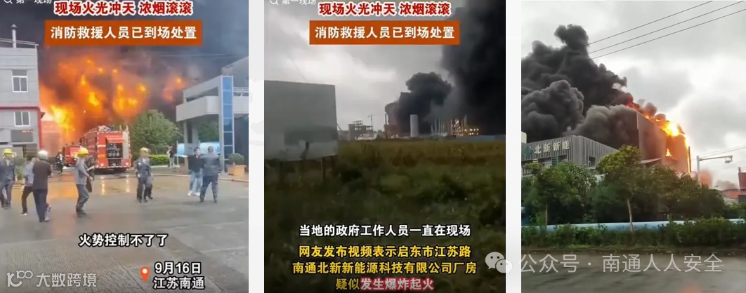 2024年9月16日下午,江苏南通启东北新一新能源材料厂房突然发生严重火灾。火灾现场爆炸声不断,火光冲天,浓烟滚滚。多辆消防车赶赴现场,救援起来相当困难。