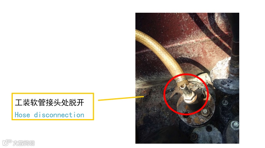 加温管吹通过程中,加温管上软管工装接头脱落导致管内废水流淌到甲板面遇明火致使废水面残留的石脑油燃烧。