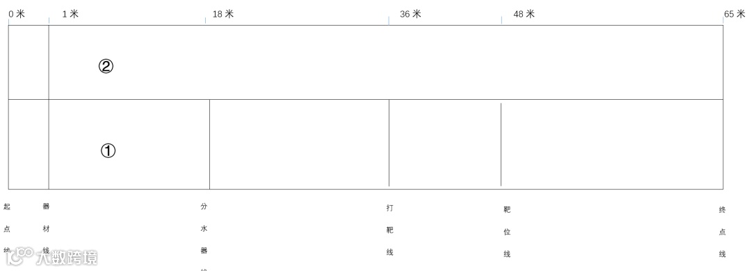 号跑道,标出起点线、器材线、分水器线、打靶线、靶位线和终点线(如图所示)。在器材线上分别放置水枪一支、