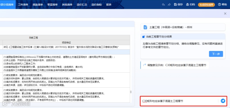 a. AI自动划分章节:系统根据清单内容自动章节划分,实现相似清单的聚类,。