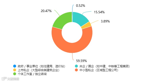 中介咨询占比高:46.89%就职于造价事务所/招标代理,施工方次之(39.9%)。