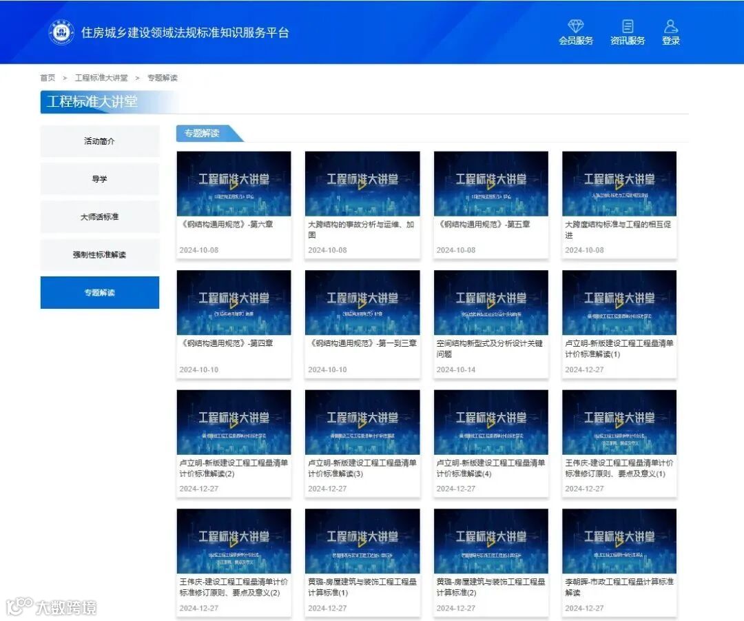 打开住房城乡建设领域法规标准知识服务平台(网址为:www.kscecs.com),点击网站首页顶部入口,即可直接进入“工程标准大讲堂”观看课程。