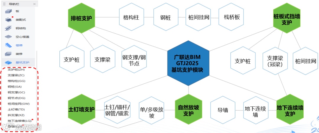 基坑支护算量作为GTJ2025其中一个组件化模块,突破了支护类型多样、钢筋配筋复杂、节点形式多的三大难题,覆盖排桩、土钉墙、自然放坡、桩板挡墙、地下连续墙五大支护类型,解决手算复杂、钢筋计算难、Excel数据难沉淀的问题,实现复杂模型土建钢筋工程量精准计算,为基坑支护算量工作提质增效。