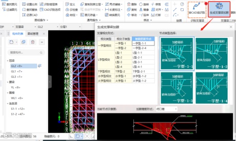 生成支撑梁加腋:点击【生成支撑梁加腋】,框选或点选支撑梁范围,右键确认后,软件按照绘制的梁相交形式,智能匹配对应相交加腋节点,输入对应尺寸和钢筋信息即可,一键生成加腋体;