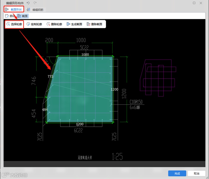 异形梁:截面和钢筋都可以直接识别大样图,识别完毕有校核功能,可以自己调整纵筋属性是属于上部、下部、侧面纵筋;