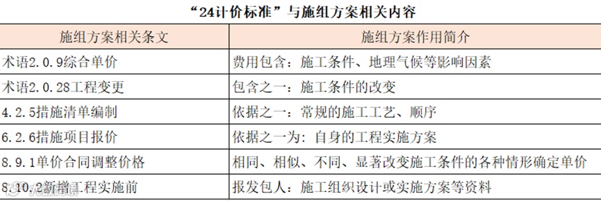 “24标准”条文中与施工方案直接相关的是措施项目报价,如第6.2.5条措施项目报价,其依据之一为:自身的工程实施方案。而措施费以“项”计时,施工方案侧重点则变为降本增效。