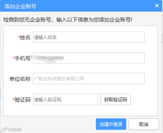 →如果没有企业员工账号,如【图3】点击【企业账号】——弹出【添加企业账号】弹框【如图4】——输入账号信息——【创建并登录】,创建成功账号及密码以短信形式发送到手机。