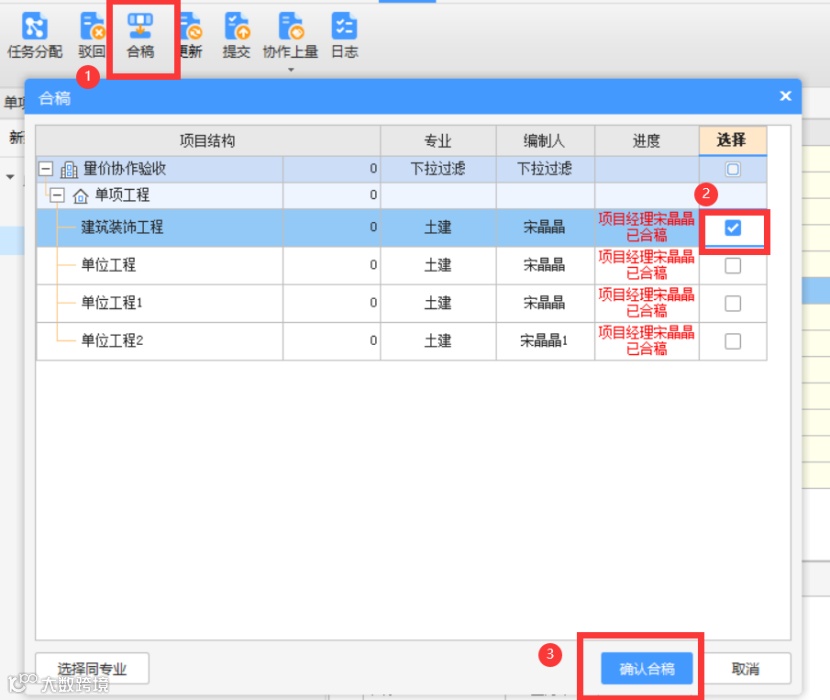 点击【合稿】——勾选需要合稿的单位工程——点击【确认合稿】,合稿成功(如图7);工程名称前显示蓝色合稿标识(如图8),同时项目经理获得单位工程修改权限及编制人保存的最新数据,单位工程编制人取消修改权限。