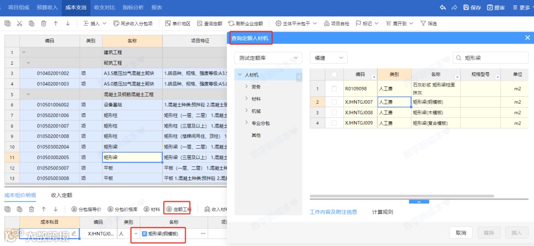 2、经过内部验证后,将企业定额部署在软件中,测算时查询调用。