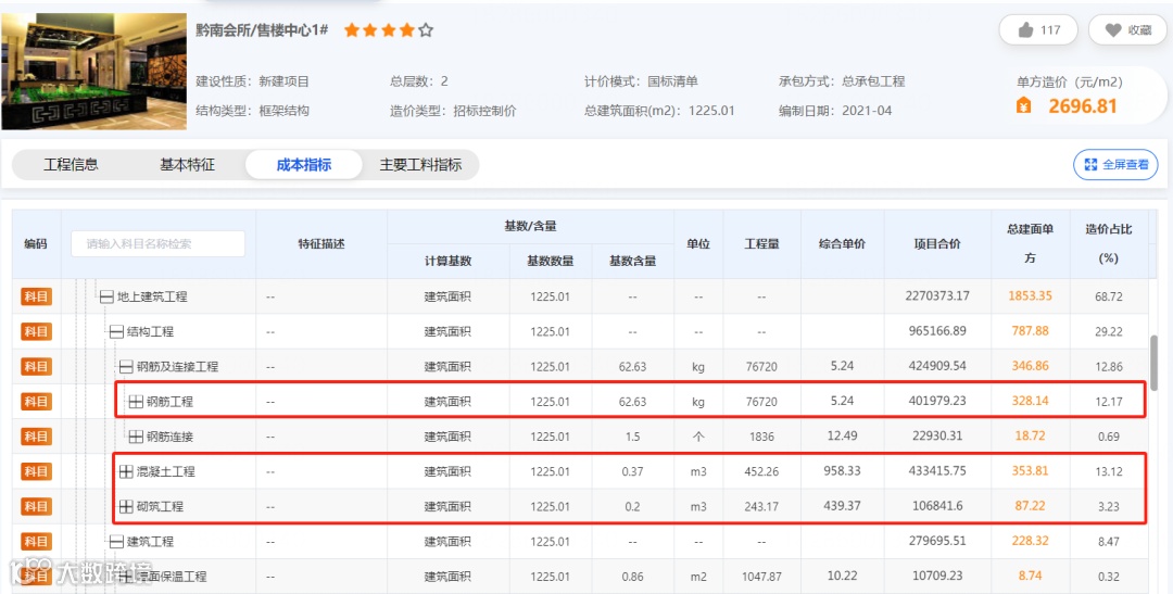 3、造价人员使用指标神器采用公式的科目标准分析指标;