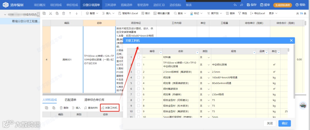 2、清单的主要材料建立关联,清单和所属工料同页面展现,关联清晰且方便检查。
