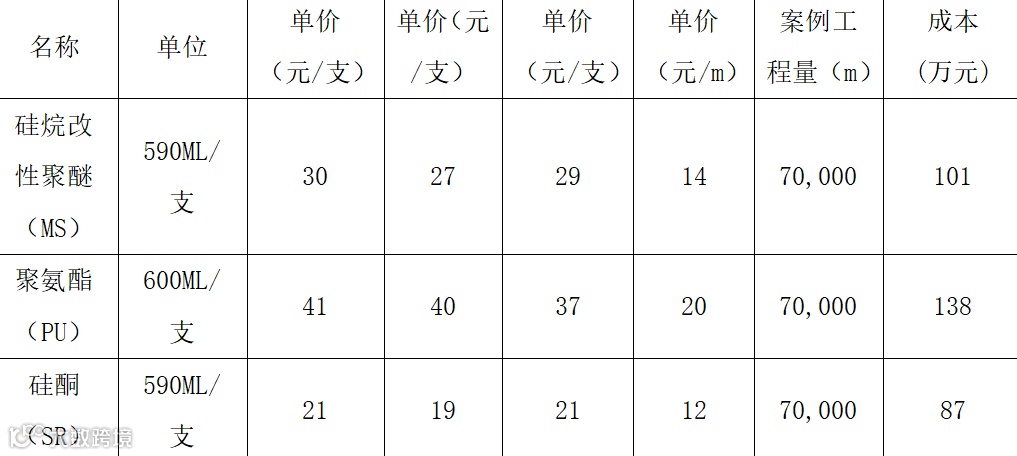 目前国产品牌安泰、白云、之江等主要产品为硅烷改性聚醚(MS)、硅酮(SR),进口品牌西卡、陶熙主要产品为聚氨酯(PU)。经市场询价,可知硅烷改性聚醚(MS)27~30(590ML/支),聚氨酯(PU)37~41(600ML/支)。