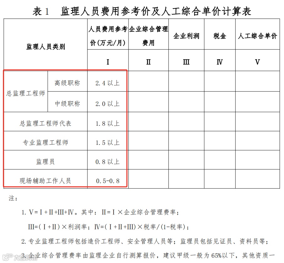 监理人员费用参考价