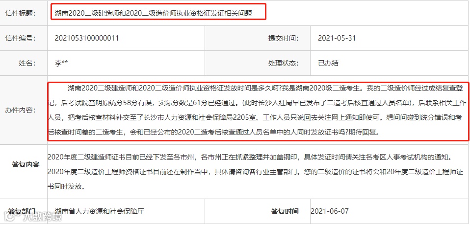 我的二级造价师经过成绩复查登记,后考试院查明原统分58分有误,实际分数是61分已经通过。(此时长沙人社局早已发布了二造考后核查通过人员名单),后联系相关工作人员,把考后核查材料补交至了长沙市人力资源和社会保障局2205室。工作人员只说回去关注网上通知即使可。