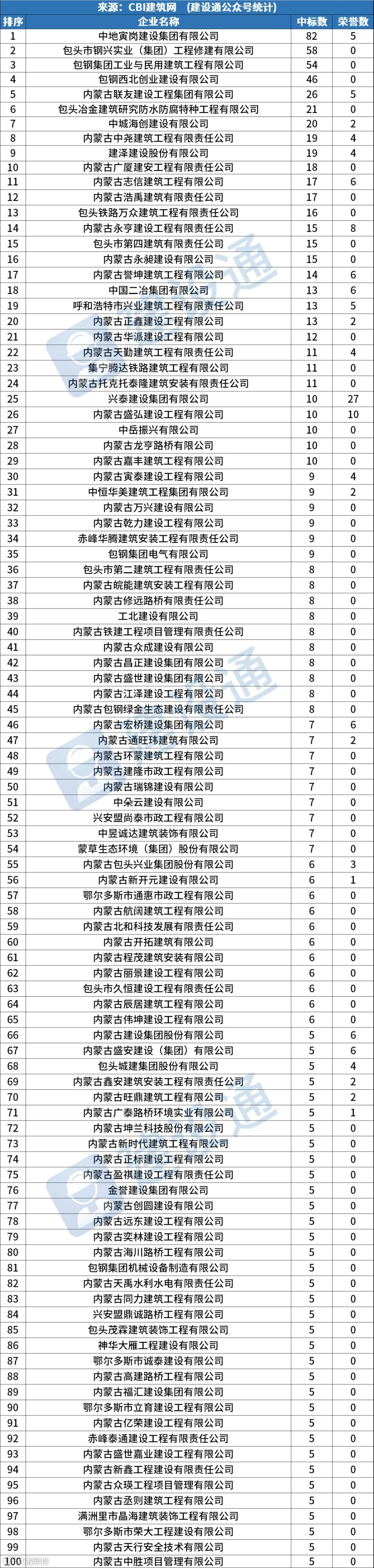 CBI建筑网综合报道:在2023年8月,内蒙古建筑施工企业中标数量达5351项,环比(与上个月相比)上升2.77%,同比(与去年同期)上升4.74%。其中,中地寅岗建设集团有限公司、包头市钢兴实业(集团)工程修建有限公司、包钢集团工业与民用建筑工程有限公司分列中标数量排行榜前三位。