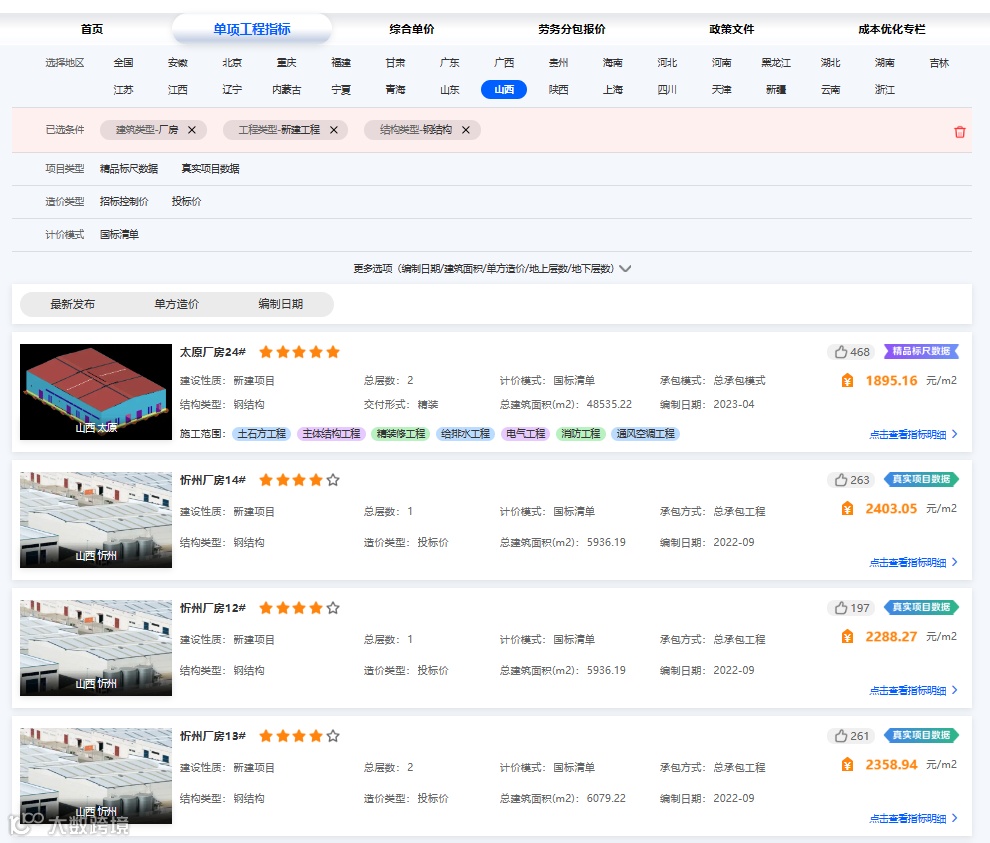 ①用指标神器导入自己企业内部不同楼号的工程,完成各楼号指标分析后企业内部数据对比,再导入指标网上找到同类型的样本项目3-4个单体进行对比分析,一个页面直接搞定,直接进行重点复核;