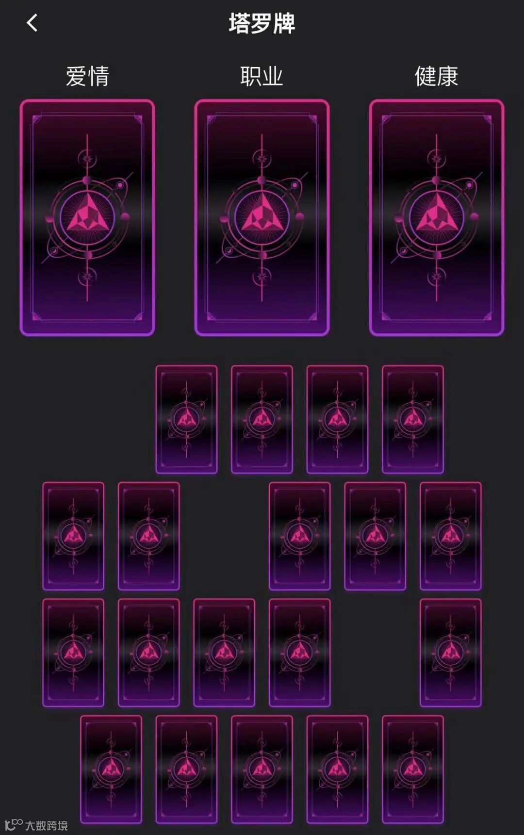 找到【图片工具】中的【塔罗牌】。在系统随机提供的23张牌中,挑选出三张牌放在对应位置,大数据将会根据牌面内容分析你的爱情,职业与健康。