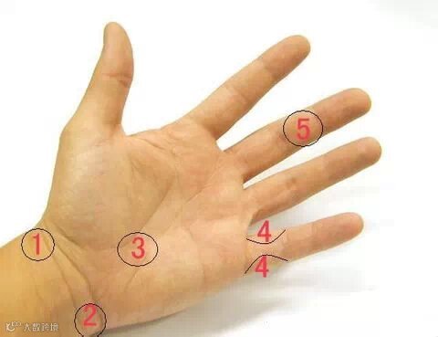 1、鱼际穴:大鱼际中间点,靠近骨头的位置。