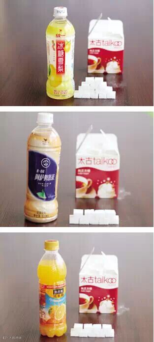 喝之前,请想想,你喝的是饮料,还是糖?(袋子里是后面饮料中所含糖份)