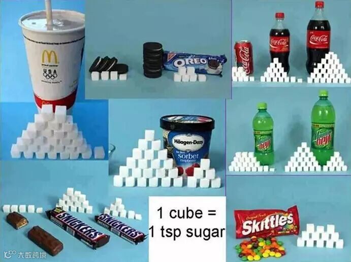 前面所堆金字塔是后方饮料中所含糖份,一个等于一茶匙。奥利奥哈根达斯势利架之类的,你们的金字塔也堆滴蛮高嘛。想想看,您喝了多少糖?换算成卡路里,姑娘,您的肥白减啦!
