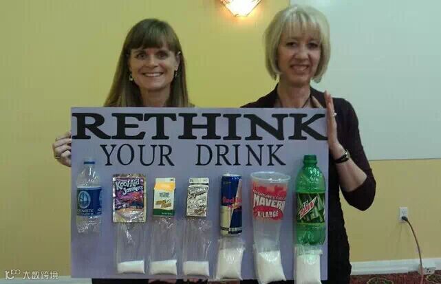 “想想你在喝什么,Rethink your drink”是一项美国2011年从某高中广泛兴起的公益活动。测测真相的目的是帮助年轻人和成年人减少含糖饮料的消费。鼓励他们多喝白开水和其他替代性的健康饮料。它聚焦到中低收入人群,传播含糖饮料和导致肥胖及糖尿病之间的关联。