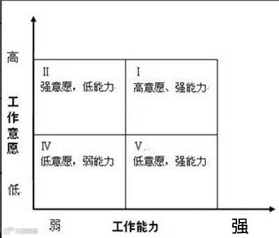 对于任何企业而言,按照员工的能力和工作的意愿(态度),都可以将员工分为四类。如下面的象限图所示: